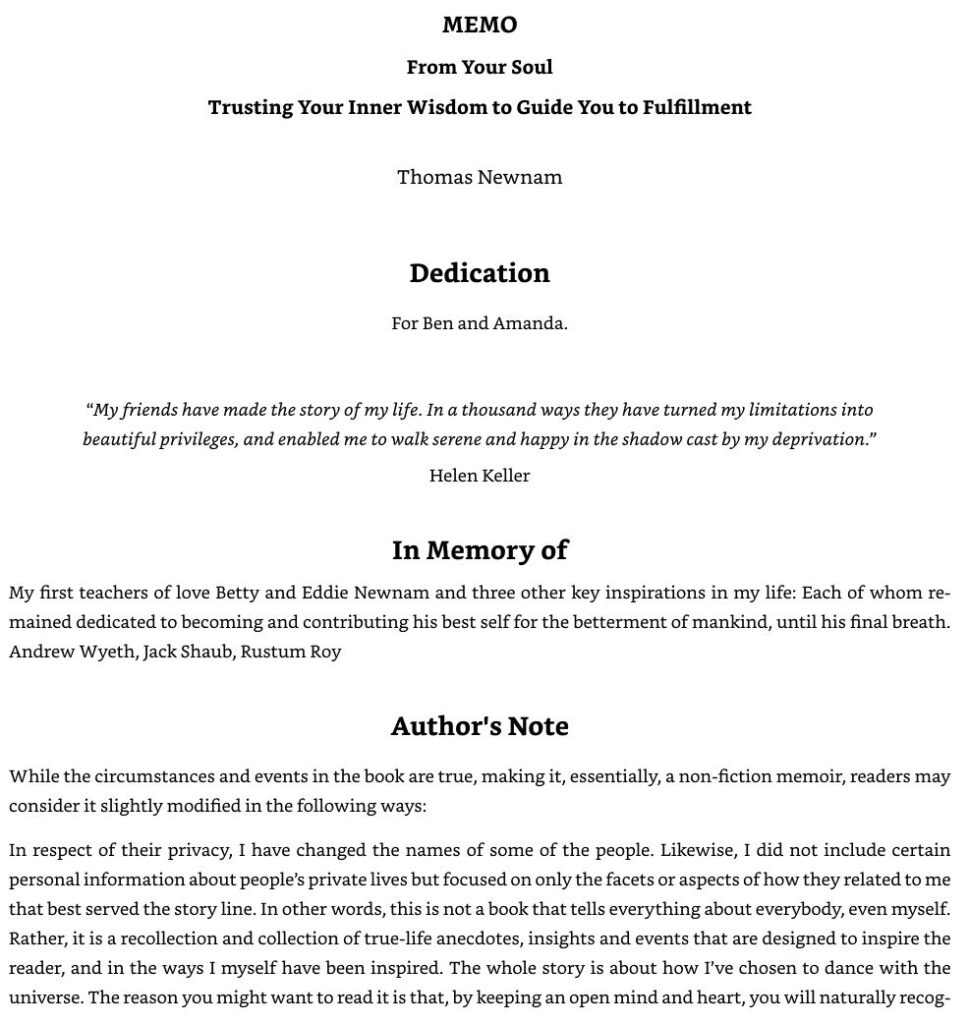 Part autobiography, part spiritual guidebook, Memo from Your Soul, is Tom Newnam’s 2011 reflection on his life experiences that led him to find greater peace, fulfillment, compassion, and inner-knowing about life’s great lessons – the same lessons and wisdom that are available to all.