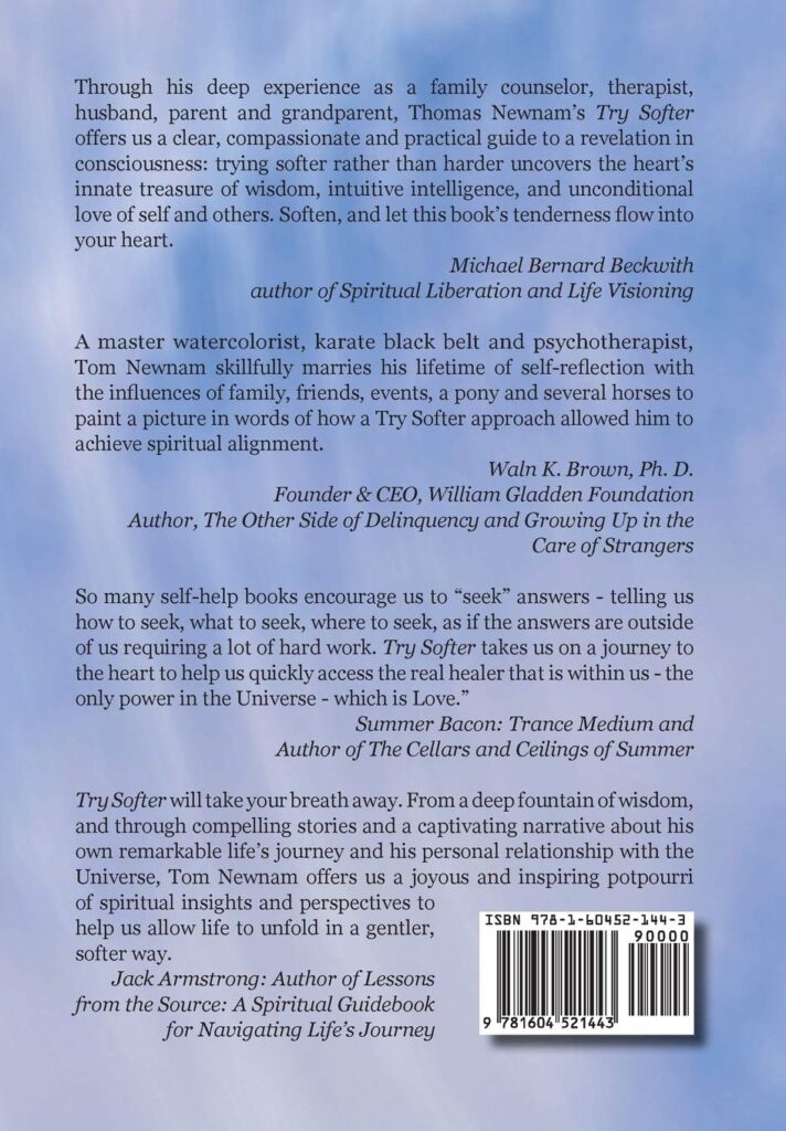 Through his deep experience as a family counselor, therapist, husband, parent and grandparent, Thomas Newnam’s TRY SOFTER offers us a clear, compassionate, and practical guide to a revelation in consciousness: trying softer rather than harder uncovers the heart’s innate treasure of wisdom, intuitive intelligence, and unconditional love of self and others. Soften, and let this book’s tenderness flow into your heart.